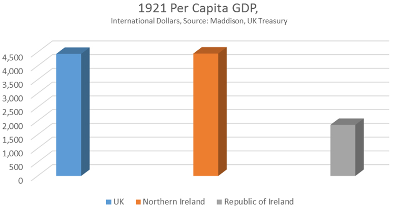 The industrial area around Belfast had long been the most prosperous part of Ireland and enjoyed a particular boom during the course of the First World War. As a result, despite the post-WWI decline, UK Treasury estimates show that per capita GDP was fractionally higher in NI than the UK as a whole at that time. By contrast, outside of Dublin the rest of Ireland was largely rural. On UK Treasury estimates at the time of Partition, per capita GDP in what is now the RoI was 45% of the level of what is now Northern Ireland.