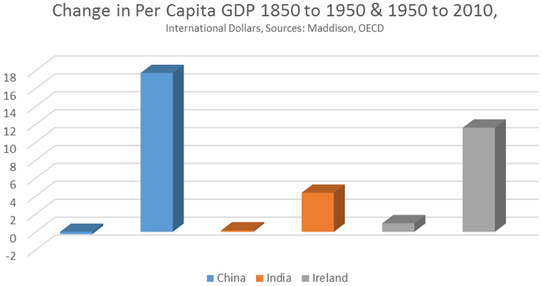 For China there was no growth of this measure at all over the course of a century. Per capita GDP actually fell by a quarter under British/French/US and then Japanese rule. In India, per capita GDP grew by one-sixth over that period while in Ireland it almost doubled.